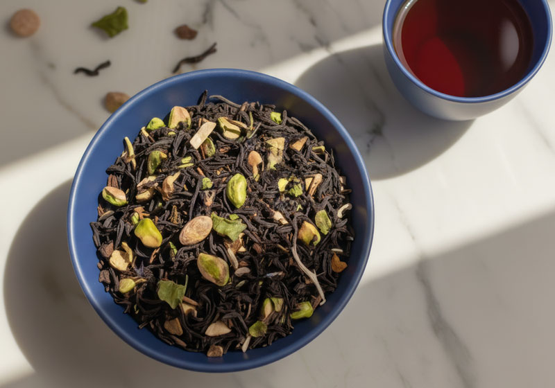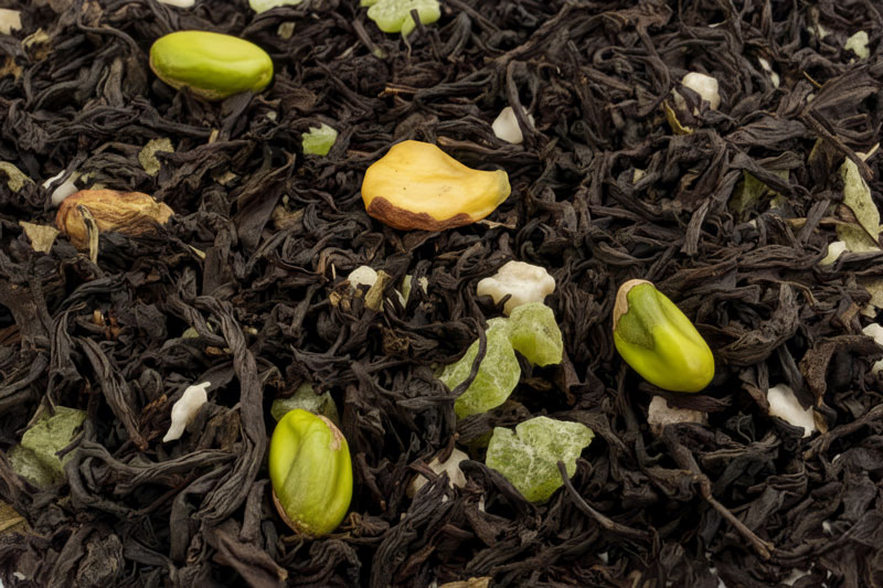 Терпкость плотного чёрного чая сочетается с насыщенными нотами молочного шоколада и яркими оттенками фисташки.