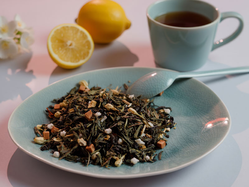 Состав: чай зелёный рассыпной листовой крупный, чай чёрный рассыпной листовой крупный, цукаты лимона, цедра лимона, кусочки карамели, ароматизаторы, цветки жасмина.