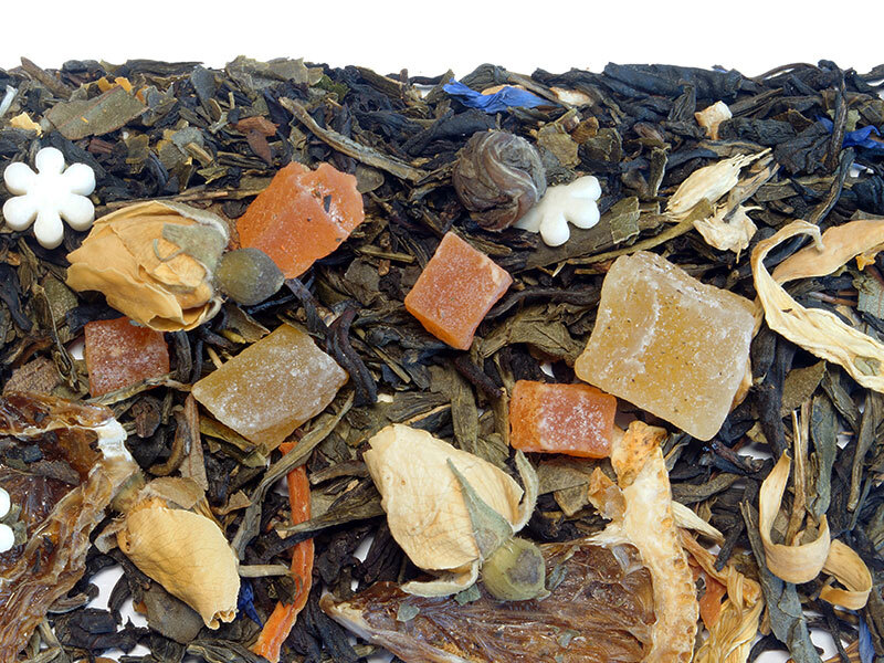 Состав: чай зелёный крупнолистовой, чай чёрный крупнолистовой, кусочки манго, посыпка кондитерская, кусочки апельсина, цукаты ананаса, бутоны розы, ароматизатор, лепестки подсолнечника, лепестки василька, чай белый крупнолистовой, плоды шиповника, имбирь, корица, лимон, лимонный мирт, морковь.